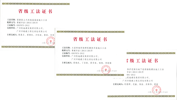 2013年4月,我公司與廣州機施集團合作完成的《弱膨脹土天然地基基礎(chǔ)施工關(guān)鍵技術(shù)研究》、《大面積鋼網(wǎng)架群機整體吊裝施工關(guān)鍵技術(shù)研究》及《地鐵保護范圍內(nèi)地下連續(xù)墻銑槽法施工關(guān)鍵技術(shù)研》三項工法取得省級工法證書。